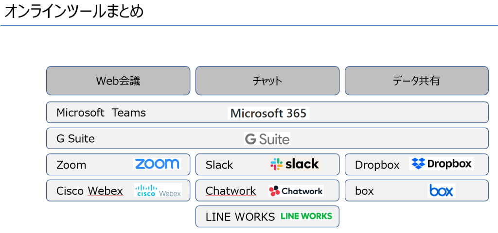 リモートワークに必要なオンラインツールには以下の図のように3つの観点からのツールが必要です。導入する企業のIT環境に応じて最適なツールを選定すれば良いです。以下の図は代表的なツールも一緒にまとめています。