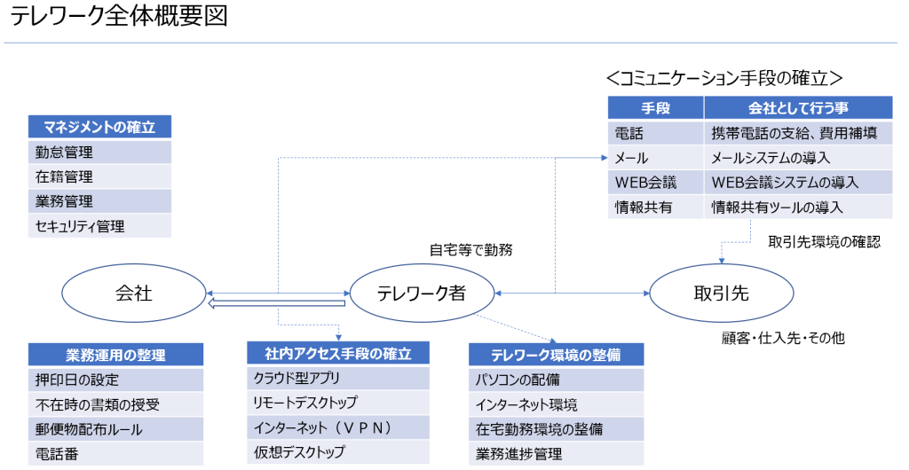 A社は首都圏近郊に本社を置く家具の製造・販売を行う中小企業です。社員は、製造部門・販売部門・管理事務部門合わせて40名の規模です。コロナ禍にあって、リモートワークを進めたいと考えましたが、どのように進めたら良いか相談があり、支援を行いました。